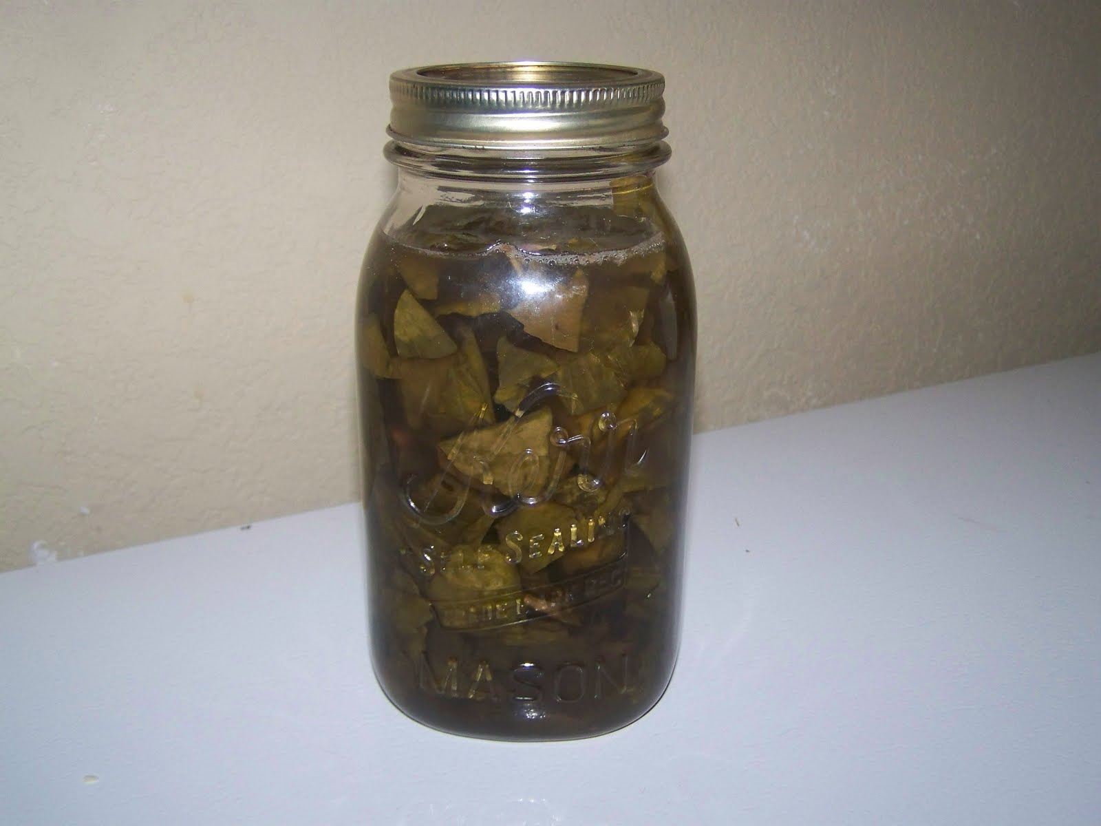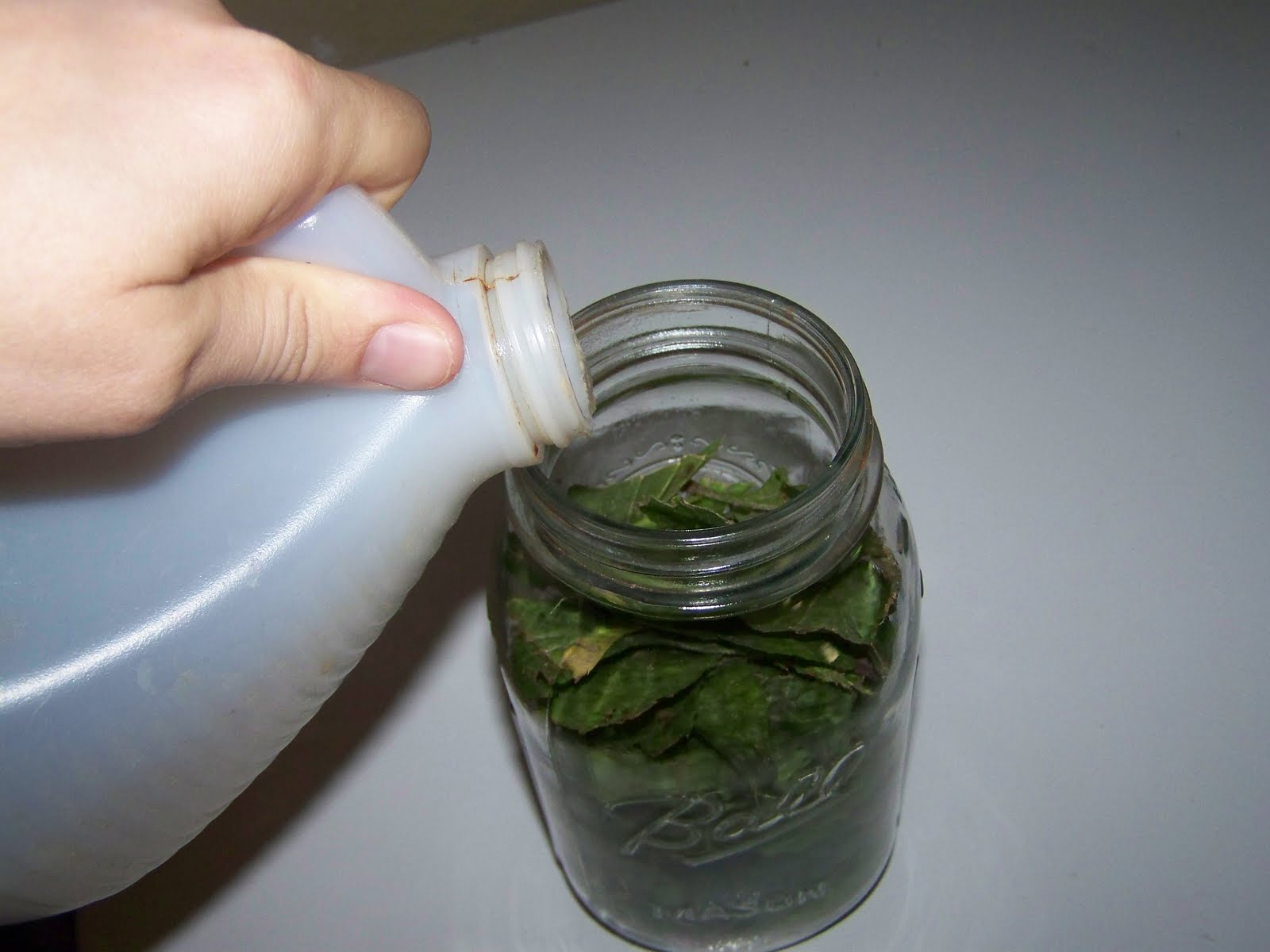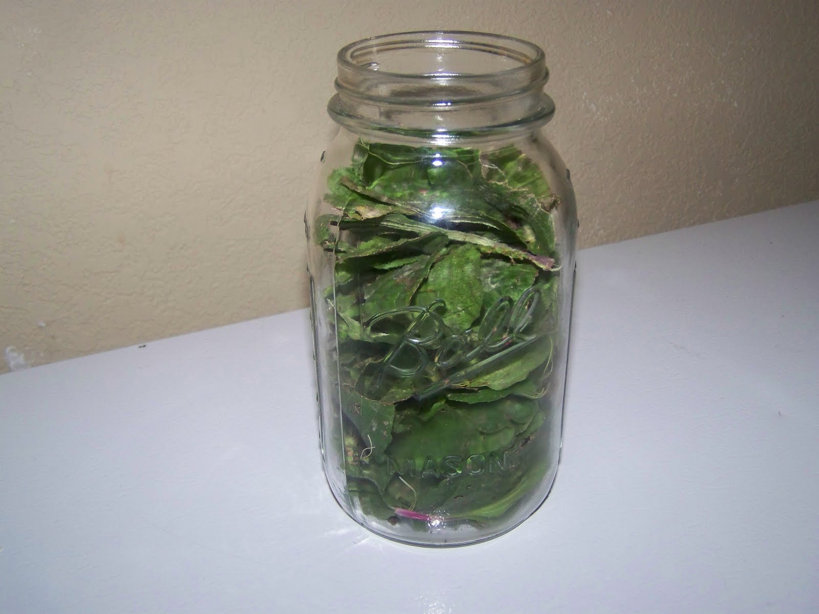 4. Place them in the jar to the top. Don’t pack it down or too tightly. You want there to be enough leaves in there to make a strong tincture, but loose enough to be able to shake well.