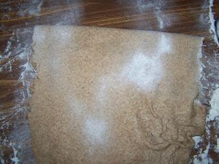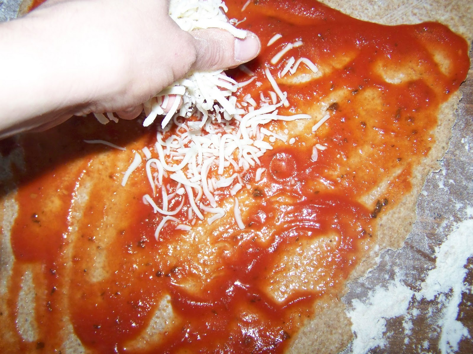Drizzle about 4 T. olive oil over dough and knead for 5 min. Roll the dough out into a rectangular shape until it’s 1/4 inch thick.