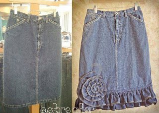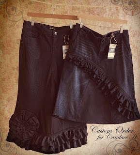 You may have seen the skirt I posted on facebook a few months ago. This is a skirt I mailed to Love My Jean Skirt, and they added the ruffles and rose. I love it!