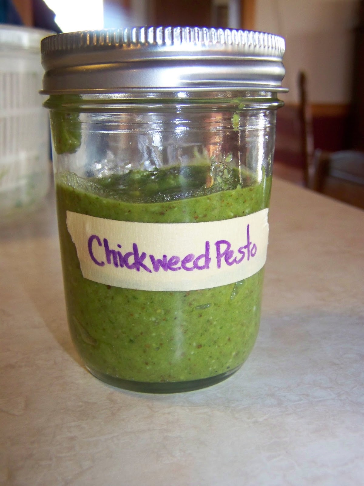 And we made yummy, very healthy chickweed pesto. {Click here for this pesto recipe} The kids really enjoyed eating this with crackers! A powerhouse of nutrition!