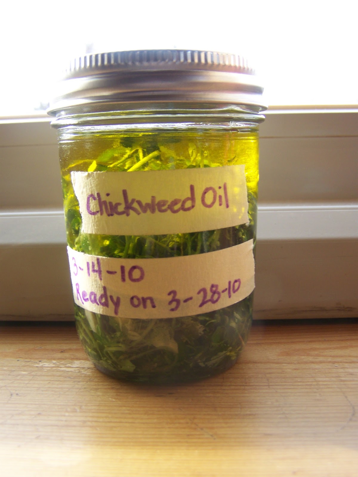 To make an herbal oil, simply fill a jar with fresh chickweed {fill jar halfway if using dried} and cover with olive oil. Push all the air bubbles out with a spoon and cover with a tight lid. Keep on counter and shake daily for 2 weeks. Strain the liquid from the herb and you have an herbal oil!