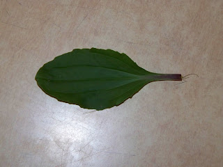 Here’s a single plantain leaf I picked. Notice that towards the bottom of the stem, it has a purplish color. There are some plantain plants in my yard that don’t have as much of a purplish color on the stem – but they are still good plantain! This is the front of it and..